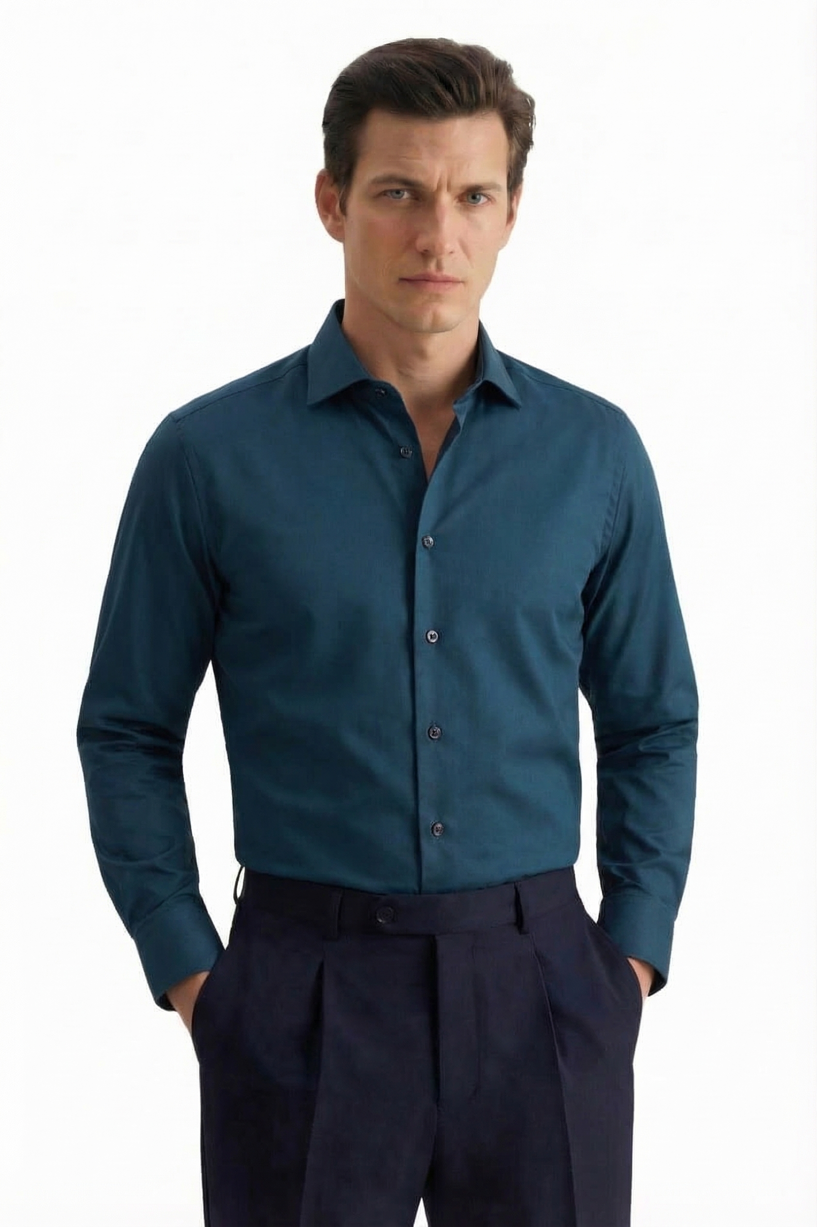 • Shaped Fit, Классический воротник, Однотонный, Темно-Бирюзовый