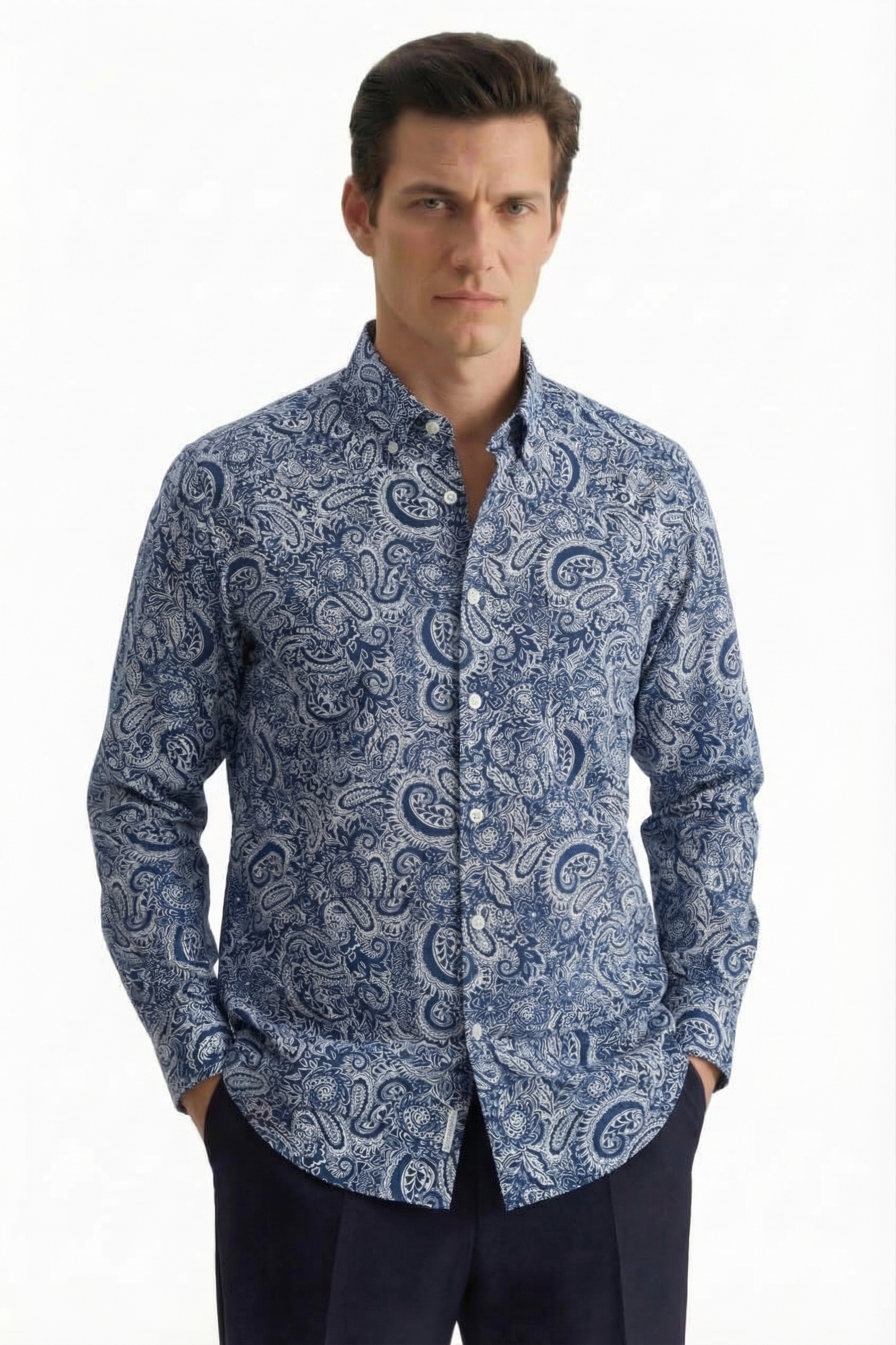 • Приталенный силуэт, Классический воротник, Классический (на пуговице), Принт, Синий