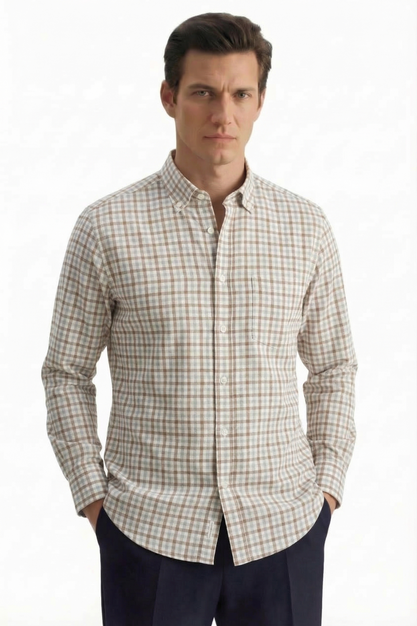 • Полуприлегающий силуэт, Классический воротник, Классический (на пуговице), Клетка, Цветной