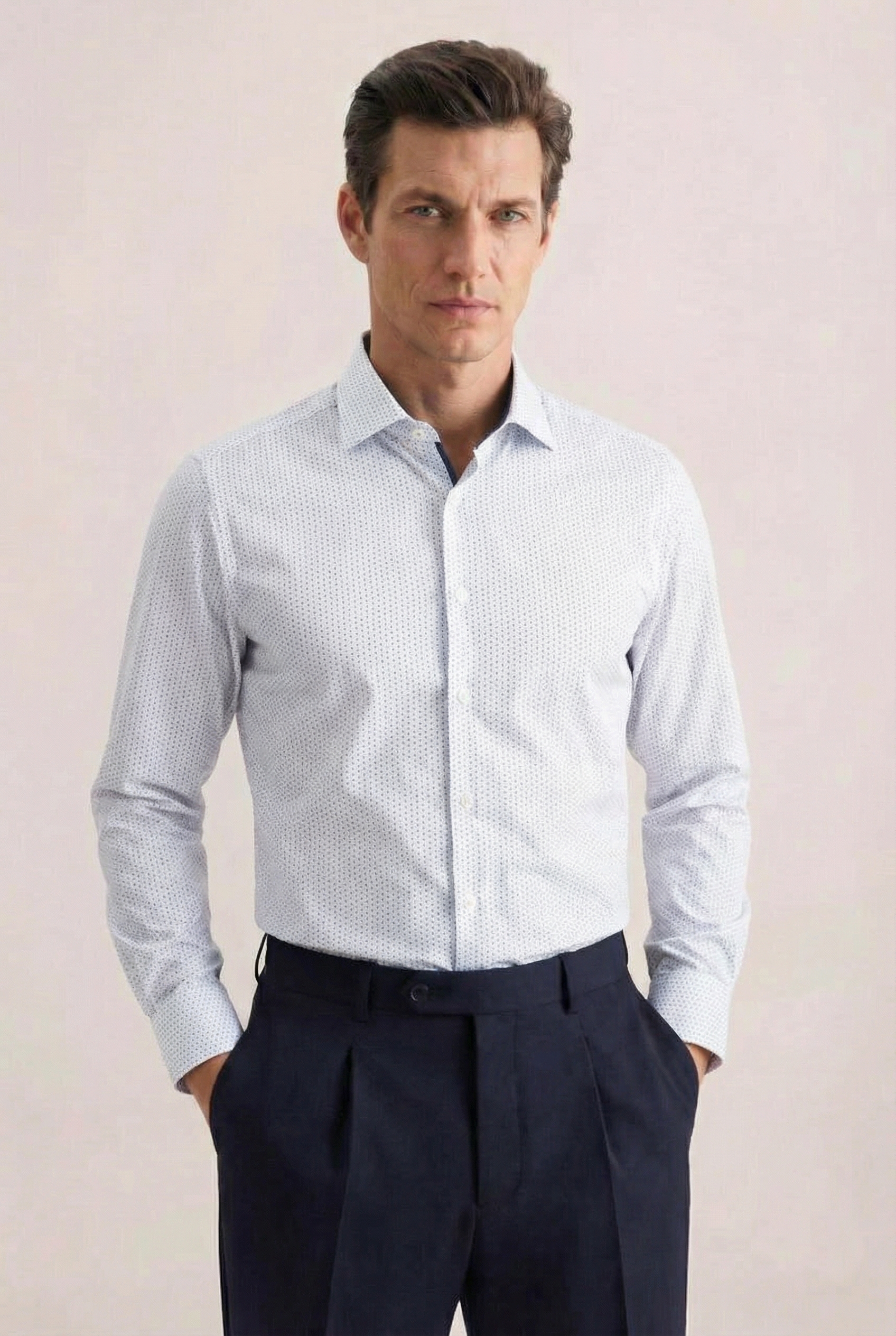 • Tailored fit, Классический воротник, Классический (на пуговице), Принт, Белый