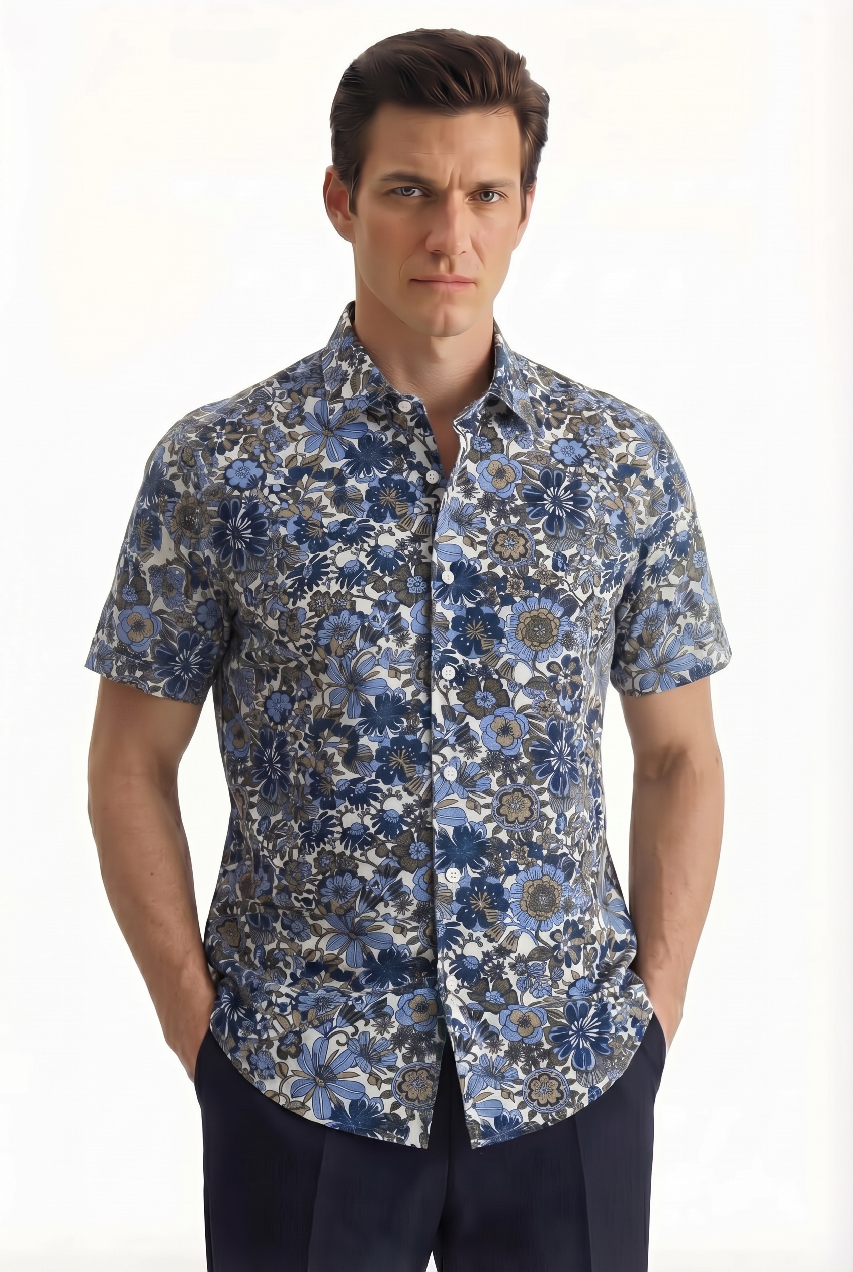 • Прямой силуэт, Классический воротник, Классический (на пуговице), Принт, Синий